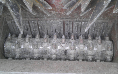 單輥式破碎機上面的主要耐磨件采用銑刨機的標準刀頭,耐磨性好,更換方便。破碎主機后擋板設置有彈簧張緊裝置,遇到無法破碎堅硬物料,擋板自動彈開有效防止電機過載或機械損壞(如圖5)。其較適合通過機械翻挖的方式獲取的超大快的RAP,故常被當做一級破碎機。
