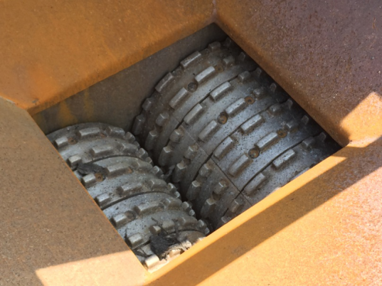 輥式破碎機的工作原理是靠轉動的輥子(如圖4),將進入破碎機的材料通過輥子之間的摩擦力帶入破碎腔,隨著帶入的深度越深,輥子之間的距離越小,從而達到破碎目的。破碎完的物料從底部排出。輥子的破碎過程主要是靠擠壓作用和剪切作用,此方式最適合RAP物料的特性,不容易破壞物料的級配。且現場工作過程中幾乎無粉塵產生,輥子轉速較低,有效的減少齒的磨損。
