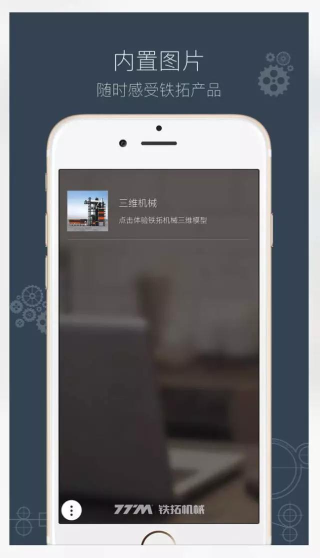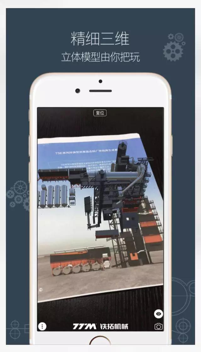 《鐵拓機械AR》是鐵拓機械專門定制的AR增強現實軟件。鐵拓機械將最新的AR技術融入工程機械,通過虛擬三維模型及視頻,讓用戶感受每款設備的細節,深入了解設備,發現工程機械的美感。通過AR軟件,識別指定的設備識別圖,即可觀看相應瀝青攪拌設備的三維模型或視頻介紹。