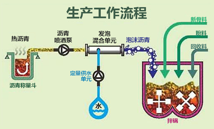在瀝青進入拌缸前,利用高壓霧化水與熱瀝青進行對撞,誘發瀝青發泡形成瀝青微泡沫,通過微泡沫形成的瀝青薄膜結構來實現較低溫度下對集料的裹覆以及降低瀝青混合料操作溫度。