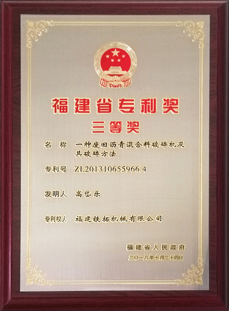 鐵拓機械瀝青路面材料再生關鍵技術——破碎篩分榮獲“福建省專利三等獎”