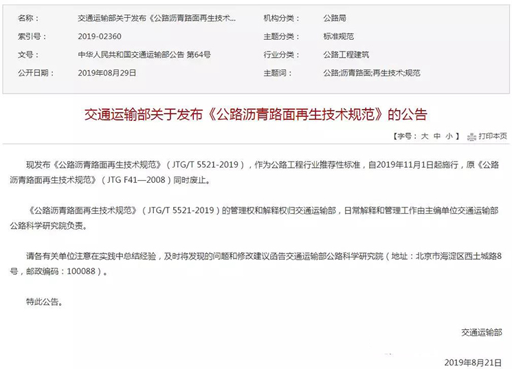 近日,交通運(yùn)輸部發(fā)布了《公路瀝青路面再生技術(shù)規(guī)范》(JTG/T 5521-2019),作為公路工程行業(yè)推薦性標(biāo)準(zhǔn),自2019年11月1日起施行,原《公路瀝青路面再生技術(shù)規(guī)范》(JTG F41—2008)同時(shí)廢止。