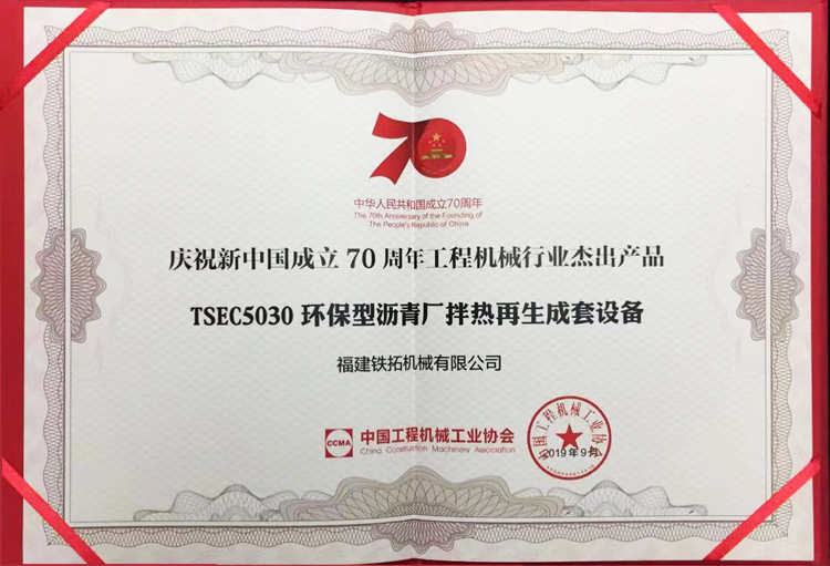 繼鐵拓機械榮獲“中國工程機械專業制造商50強”之后,專業領域產品又得一殊榮,TSEC系列逆流式瀝青廠拌熱再生一體設備被中國工程機械工業協會評選為“工程機械行業杰出產品”。為回顧工程機械行業70周年砥礪奮進的發展歷程,展示行業70年來的發展成就,中國工程機械工業協會在其主開展“慶祝新中國成立70周年工程機械行業系列評選”活動,鐵拓機械也參與到本次評選活動中,最終在行業眾多產品中脫穎而出,入選榜單贏得榮譽。
