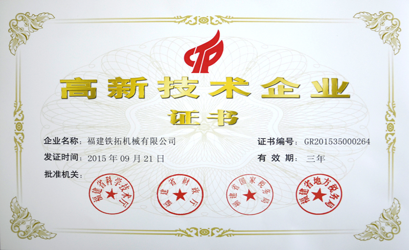 據福建省科學技術廳通知文件(閩科高[2015]37號),根據《高新技術企業認定管理辦法》(國科發火[2008]172號)和《高新技術企業認定管理工作指引》(國科發火[2008]362號)有段規定,以及《關于福建省2015年第一批高新技術企業備案的復函》(國科火字[2015]235號),認定福建鐵拓機械有限公司為福建省2015年高新技術企業。