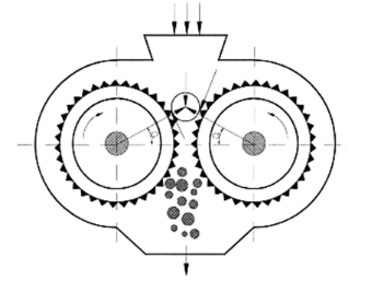 輥式破碎機的工作原理是靠轉動的輥子(如圖4),將進入破碎機的材料通過輥子之間的摩擦力帶入破碎腔,隨著帶入的深度越深,輥子之間的距離越小,從而達到破碎目的。破碎完的物料從底部排出。輥子的破碎過程主要是靠擠壓作用和剪切作用,此方式最適合RAP物料的特性,不容易破壞物料的級配。且現場工作過程中幾乎無粉塵產生,輥子轉速較低,有效的減少齒的磨損。