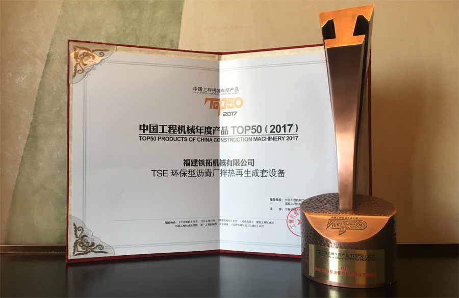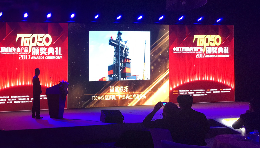 下午,2017中國工程機械年度產品TOP50榜單正式揭曉,鐵拓機械TSE系列環保型瀝青廠拌熱再生成套設備躋身年度產品TOP50榜單。