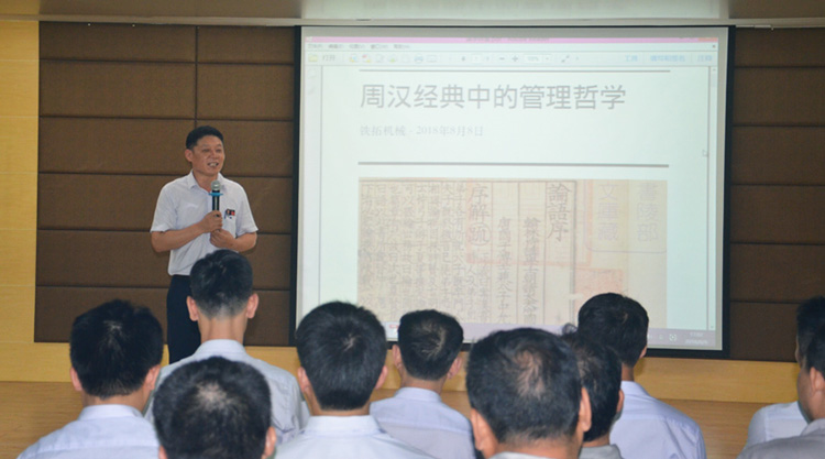 為了強化企業認同、提升員工人文素養,培養全新面貌的“鐵拓人”,鐵拓機械管理中心組織于8月8日下午開展“周漢經典中的管理哲學”國學講座,由前來參加社會實踐的清華大學人文學院博士研究生郝若辰主講,生產運營中心各部門管理人員參加。